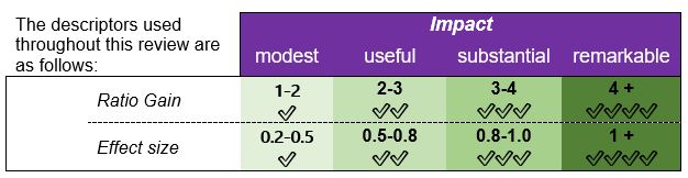 But not just any test data will do: if the test provides only raw scores, the average gain may look impressive, but what does it mean? How good is it, compared with gains in other projects and/or with national norms? We need some way of comparing the impacts of different initiatives. The two forms of impact measure used in this report are ratio gains and effect sizes.